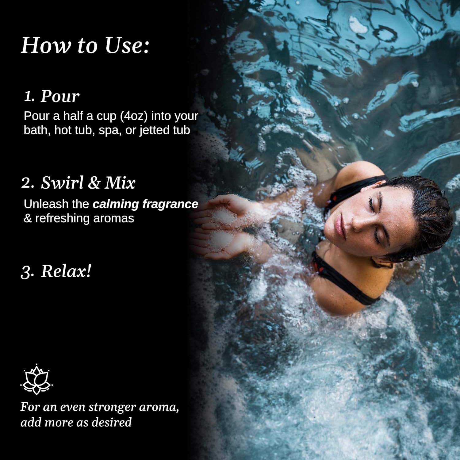 We recommend that you start with 4 oz (1/2 cup) for your soak. Most of our customer find that this is enough to provide a pleasant aroma in your hot tub or bath. If you desire a stronger aroma, add an additional 4oz. Our crystals, rich in magnesium and other essential minerals, will go to work immediately to help relax your body and soothe your mind.