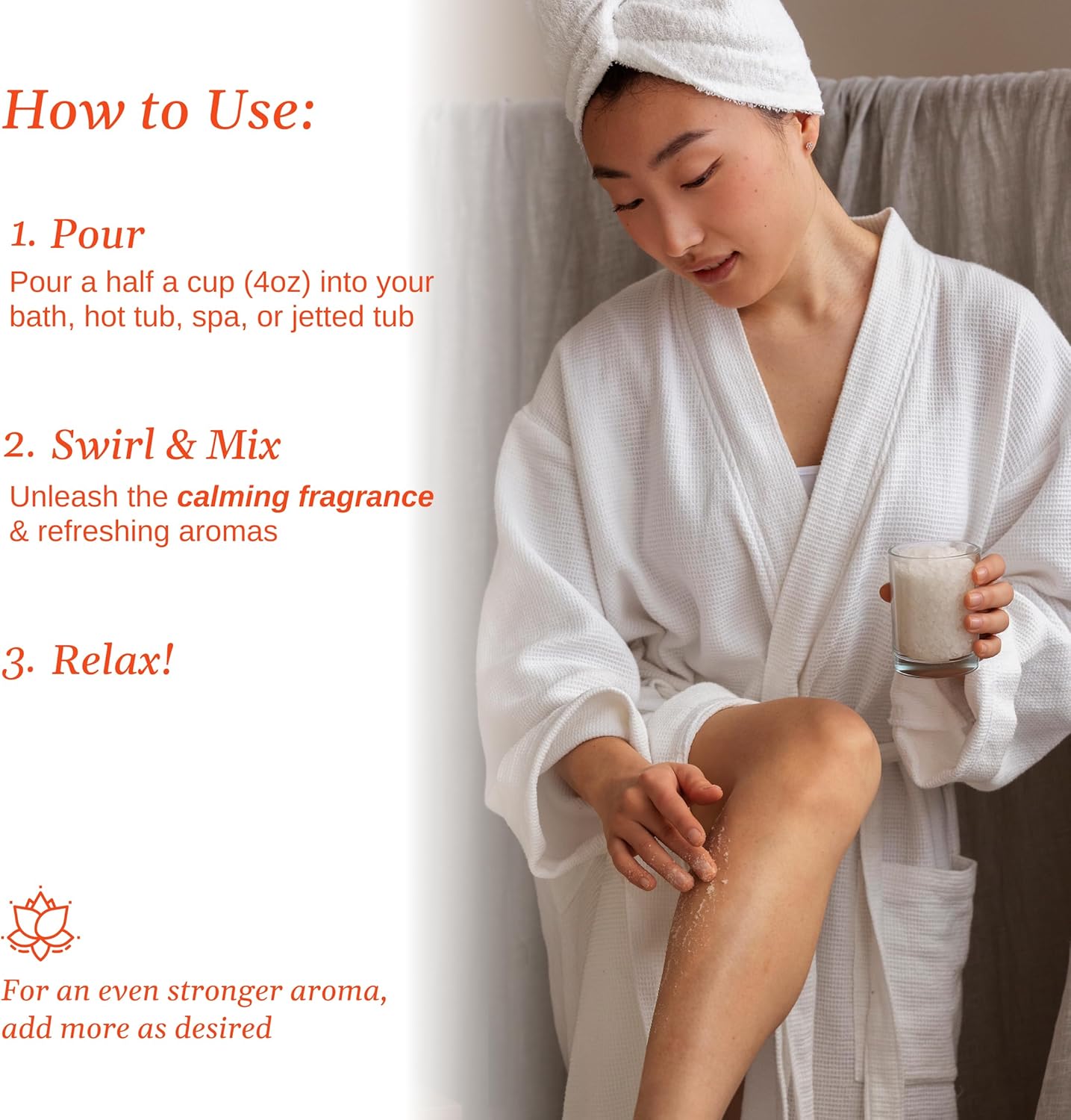 We recommend that you start with 4 oz (1/2 cup) for your soak. Most of our customer find that this is enough to provide a pleasant aroma in your hot tub or bath. If you desire a stronger aroma, add an additional 4oz. Our crystals, rich in magnesium and other essential minerals, will go to work immediately to help relax your body and soothe your mind.