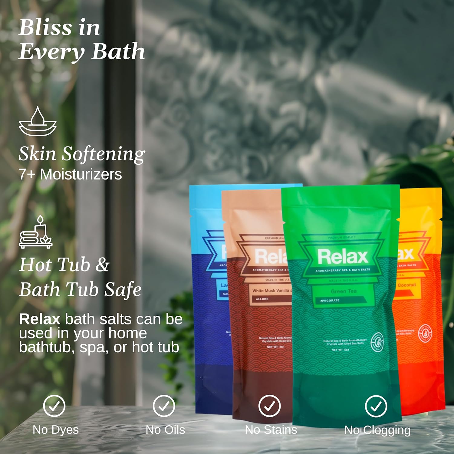 - MADE IN THE USA WITH PRESS-LOK SEAL: Proudly crafted by Relax Spa & Bath, each pack is sealed with our intuitive PRESS-LOK closure for spill-resistant storage that keeps every soak fresh and ready to indulge.